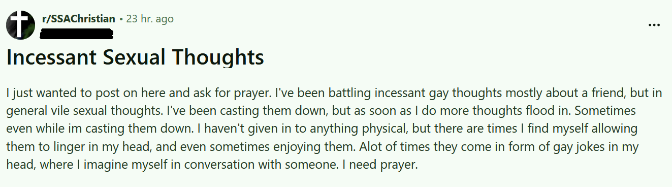 There are several lenses by which we can tackle this concern. The original poster (OP) alludes to a spiritual lens, asking for help through prayer. We can also look at this through a psychological lens¹. While both lenses offer support and are complimentary, it's the latter I want to focus on today.